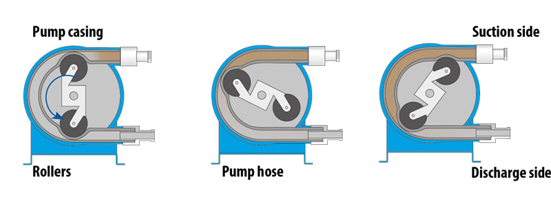 Hoạt động nhu động của máy bơm Watson-Marlow được tạo ra bằng cách nén phần tử ống giữa các con lăn. Giữa các lần đi qua con lăn, phần tử thu hồi để hút chất lỏng. Máy bơm có thể tự mồi và chạy khô, với dòng chảy riêng và không bị nhiễm bẩn chéo, không cần phớt hoặc van. Không có máy bơm dịch chuyển tích cực nào khác cung cấp sự tách biệt giữa máy bơm và chất lỏng.